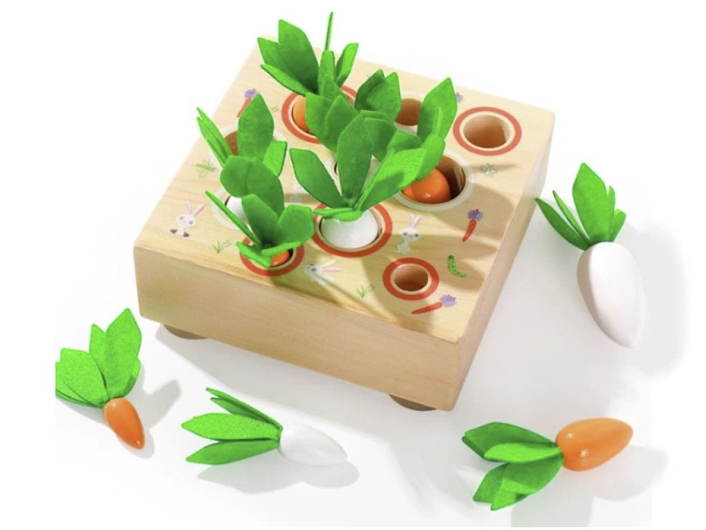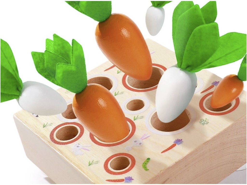 Originální dětská vkládačka s různě velkými otvory a s různě velkými mrkvičkami zdokonalí motorické dovednosti, koordinaci očí a rukou a potrápí i dětskou mysl. Při vkládání je potřeba vybrat mrkvičku nebo petržel ve správné velikosti. Pro velké šikulky je vkládací hra ztížena barevnými kroužky okolo otvorů, aby děti musely vybrat nejen správnou velikosti, ale i barvu zeleniny. Při hře děti přirozeným způsobem zdokonalují své dovednosti, učí se poznávat barvičky, rozdíl mezi větší menší, zdokonalují logické myšlení, učí se trpělivosti a soustředit se a zcela jistě si užijí i spoustu zábavy.