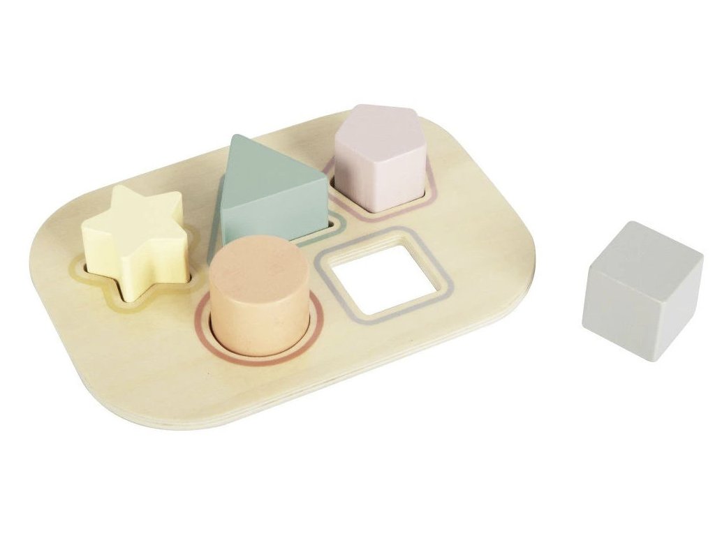 - Vkládačka - hrací box je současně vkládačkou s otvory ve víku pro vložení dřevěných kostek různých tvarů.