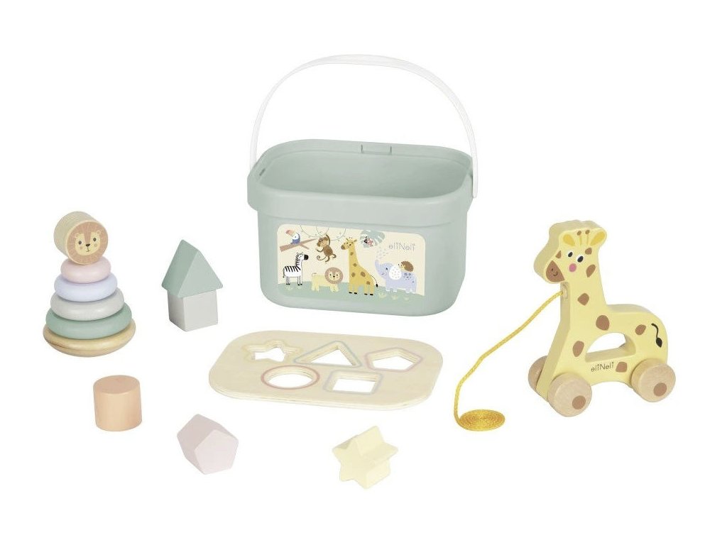 Nejoblíbenější dětské hračky, uložené v praktickém hracím boxu, který je současně i vkládačkou, jsou krásným dárkem pro děti od 1 roku. Dřevěná tahací hračka v podobě žirafy na kolečkách, dřevěná pyramida se lvem a vkládačka s motivem zvířátek ze ZOO přinesou dětem spoustu zábavy a ještě zdokonalí jejich dovednosti. Samotný hrací box je vkládačkou pro vkládání dřevěných kostek nejrůznějších tvarů i úložným boxem pro všechny dětské hračky v boxu obsažené, které díky tomu snadno a rychle uklidíte nebo vezmete s sebou na návštěvu, na víkend k babičce i na dovolenou.