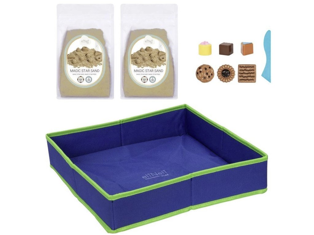 - Sada - balení o obsahuje 2 balení kinetického písku, skládací pískoviště, formičky a další příslušenství.