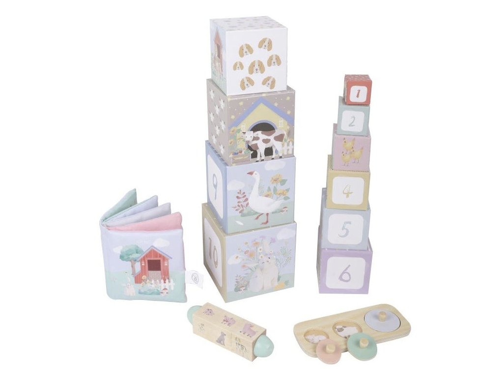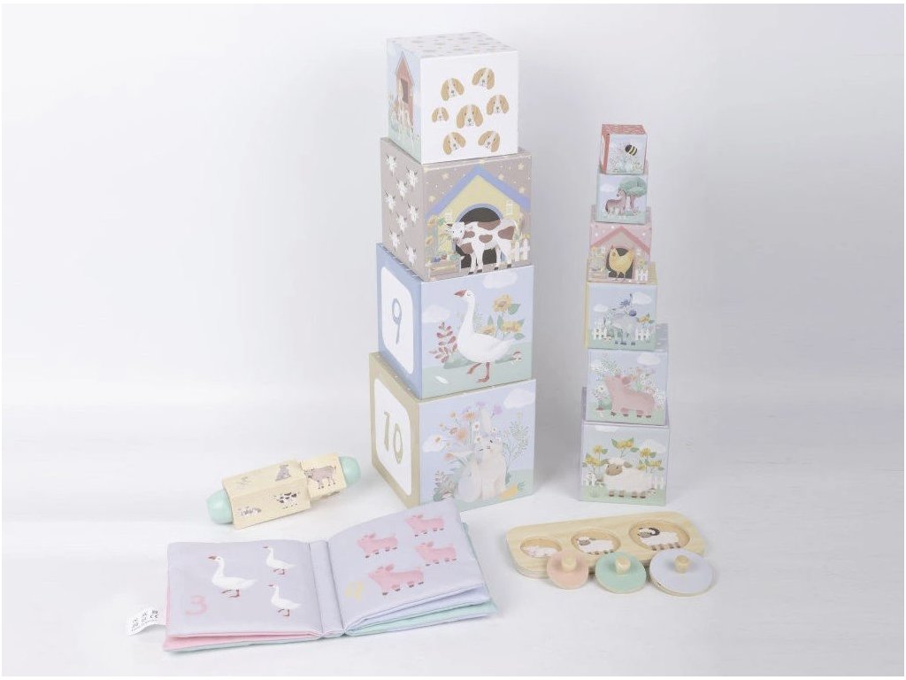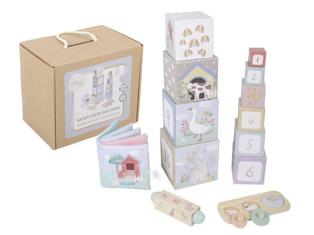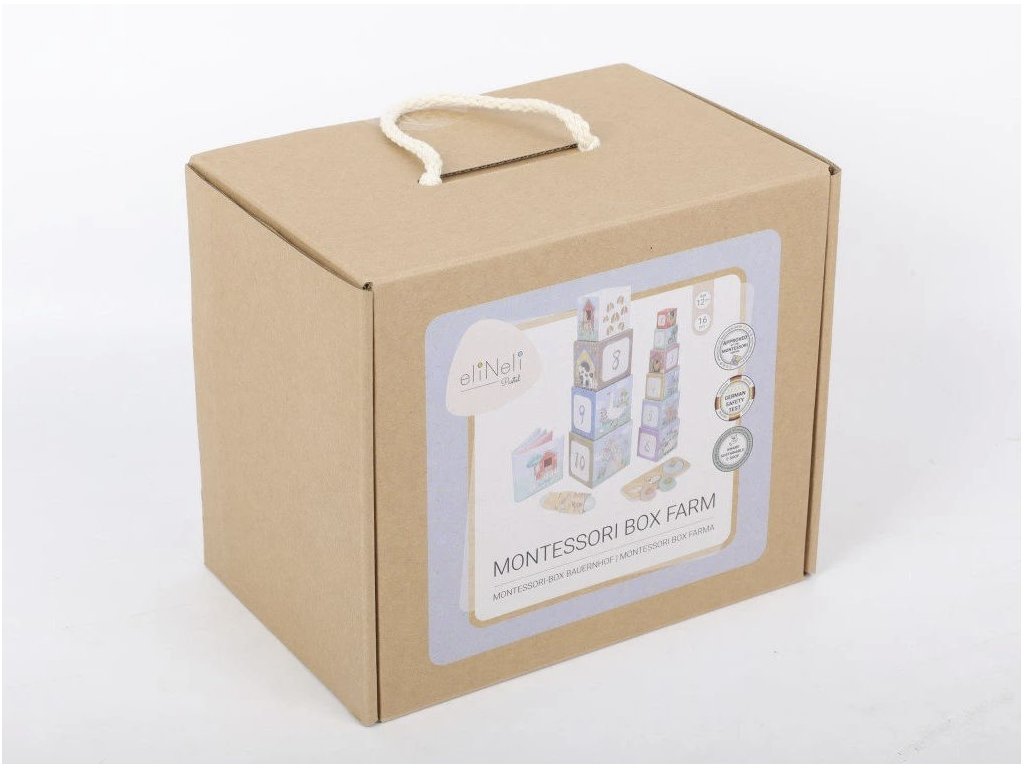 Sada montessori hraček je ideálním dárkem pro děti od 1 roku, k prvním narozeninám. Pečlivě vybrané hračky jsou v souladu s montessori pedagogikou a podporují přirozený rozvoj dítěte s přihlédnutím k jeho potřebám. Soubor 4 hraček propojuje jednotné téma - téma farma, zvířátka z farmy, kdy použité barvy respektují paletu montessori. Krásné ilustrace co nejvíce odpovídají realitě, zvířátka jsou vyobrazena v jejich skutečné, reálné podobě. V sadě děti najdou velké stohovací kostky s čísly, počítáním, se zvířátky a prostředím, ve kterém zvířátka žijí. Jednoduché vkládací puzzle seznámí děti s ovčí rodinkou. Otočné kostky seznámí děti s dalšími zvířecími rodinkami, naučí děti pojmenovat tatínka/maminku/mládě od daného zvířecího druhu. Látková kniha naučí děti poznávat barvičky, číslice, zvířátka a s nimi počítat do 8. Sada hraček v praktickém boxu přirozeným způsobem zdokonaluje motorické dovednosti, koordinací očí a rukou, prostorovou představivost, logické myšlení, děti se rozvíjí po fyzické, psychické i emoční stránce.